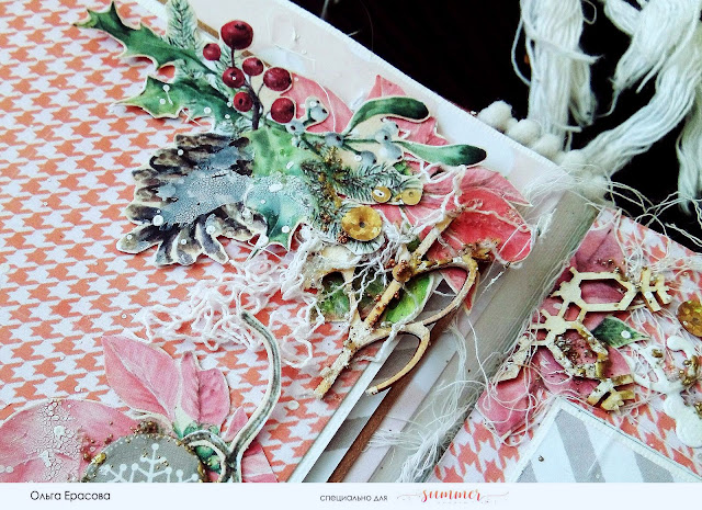 Оттенки роскошного бордового с золотыми нотами помогли мне подобрать ткань для обложки альбомчика. И золотые вкрапления в изобилии украшают миник внутри. Также с досочки я взяла зимние цветы и ягодки.